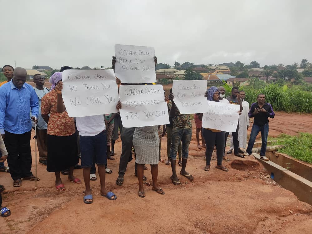The protesters want the governor to visit the community to see for himself the quality of job done by the contractor in the gully site