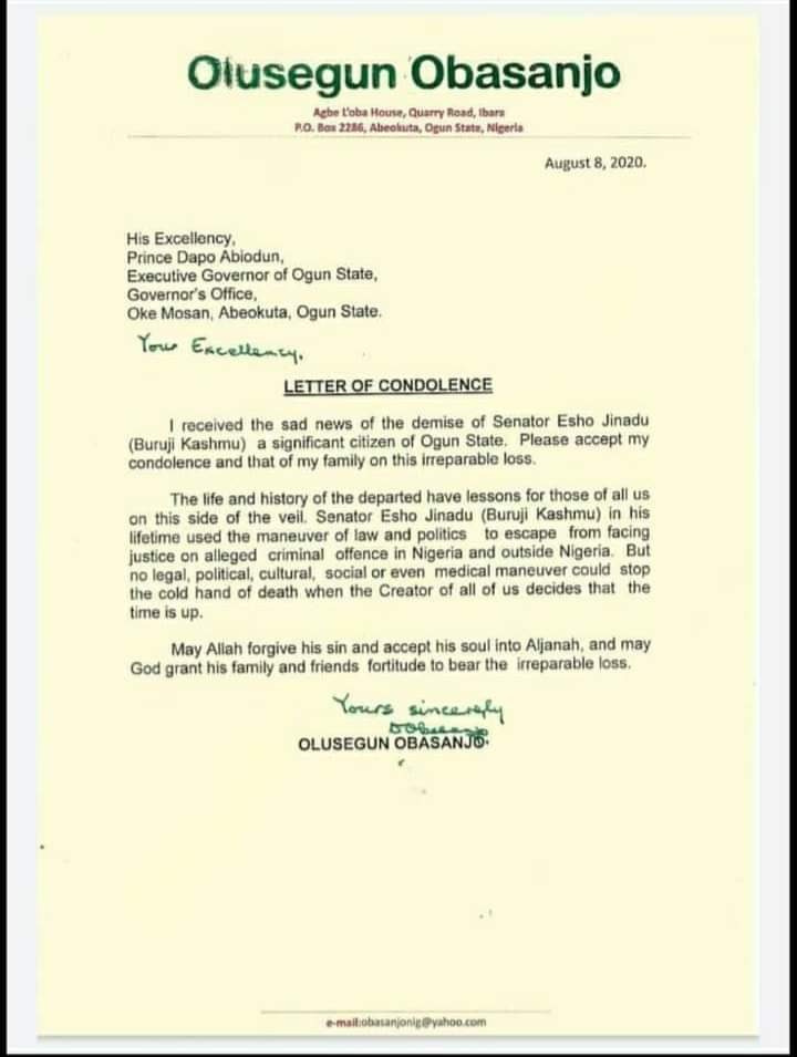 Former Nigerian president Olusegun Obasanjo has sent a condolence message to the Governor of his home state of Ogun following the death of senator Buruji kashamu. the former president described his death as an irreparable loss.